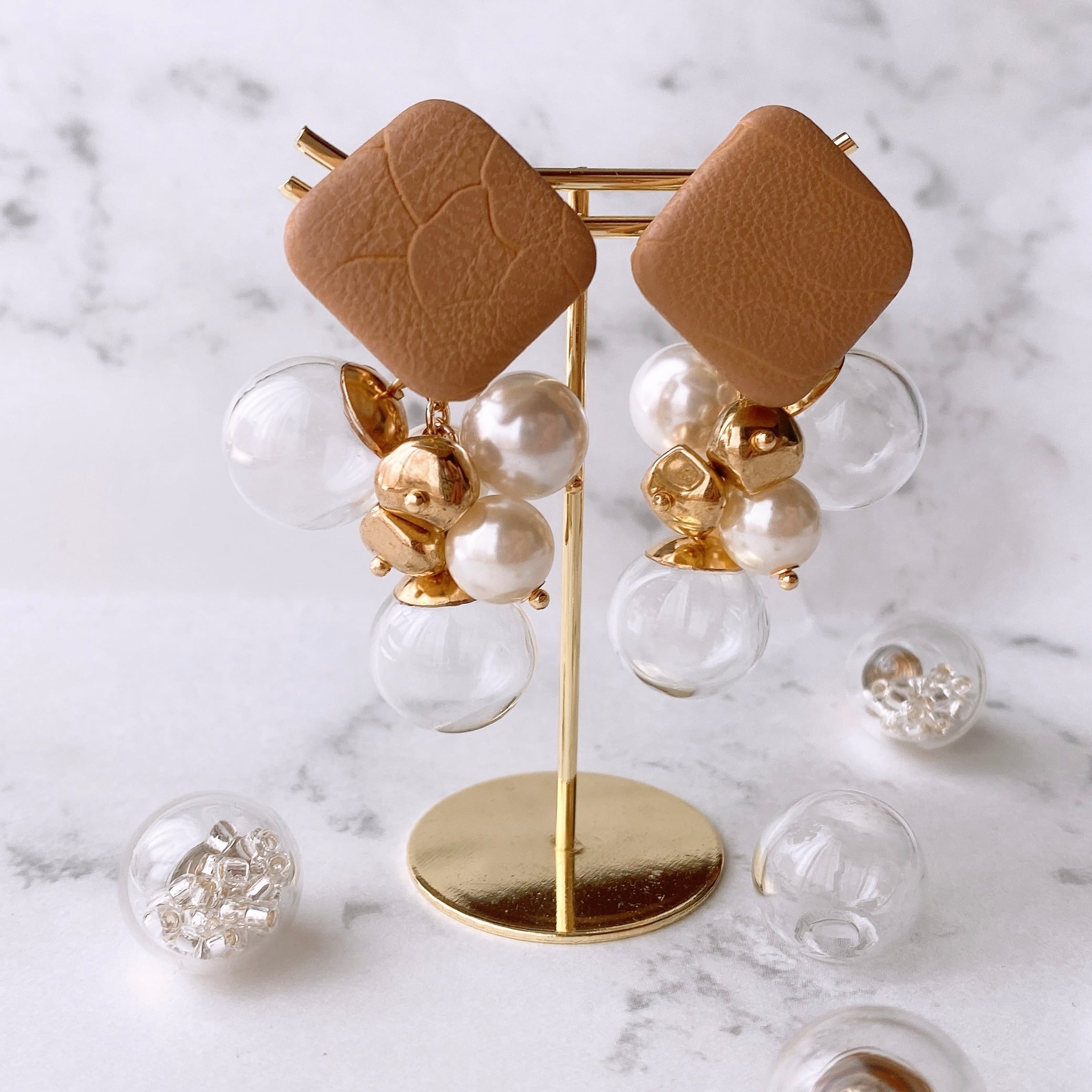 売り切れの人気デザインが、少しだけリニューアルして再登場!フェイクレザーで出来たトップパーツは、レザーの柄の入り方がどれも違っています。ガラスボールは夏っぽく、パールやゴールドビーズとの絶妙なマッチがとてもお洒落です♪