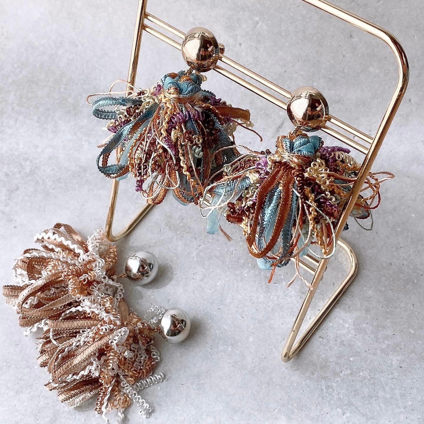 ボリュームのあるタッセルアクセサリーです。糸やリボンをふんだんに使ったデザインは目を惹くこと間違いなしです。アクセントにおすすめなブルー(カラフル)、コーディネートを選ばないブラウンの2色をご用意しております。